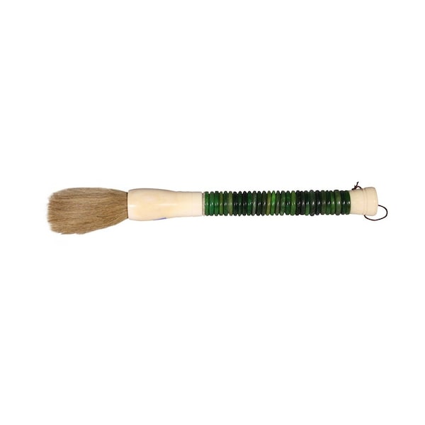 This green jade abacus disc decorative calligraphy brush will add a beautiful and unique accent to your decor. Inspired by the origins of calligraphy, this brush is now used as a decorative accent known as a sign of peace. Made of jade, which is known to be a gem of nobility and royalty, combined with fine horsetail for the brush, this unique accent is sure to be a statement piece. Can hang on the wall or use as tabletop accent. Instantly liven up your space with this art that brings color and dimension to your space. 1" H x 12" W x 1" D