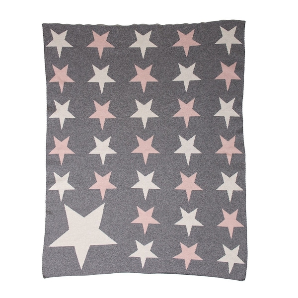Grey Ivory And Pink Stars Knitted Baby Blanket