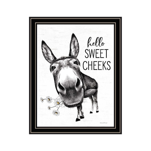 This hello sweet cheeks donkey black framed print bathroom wall art will add a beautiful decorative accent to your decor. This print is a visual artistic expression that allows you to decorate your space in style. Reproduced for you on wood, this hanging decorative accent will be a trendy and fashionable way to dress your walls in a rustic and modern farmhouse vibe. Adding this hanging wall art to your space to make your room feel more finished and attractive. Utilize this opportunity to create a focal point in the room with this fabulous wall decor option. 18-inch H x 14-inch W x 1-inch D