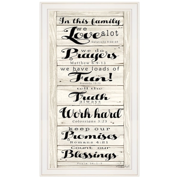The in this family 1 white framed print wall art is the perfect decorative accessory for your home. This print is a visual artistic expression that allows you to decorate your space in style. Reproduced for you on paper, this hanging decorative accent will be a trendy and fashionable way to dress your walls. Hang on your wall to add some up to date fashion and decoration. Instantly liven up your space with this art that brings color and dimension to your walls. 33-inch H x 19-inch W x 1-inch D