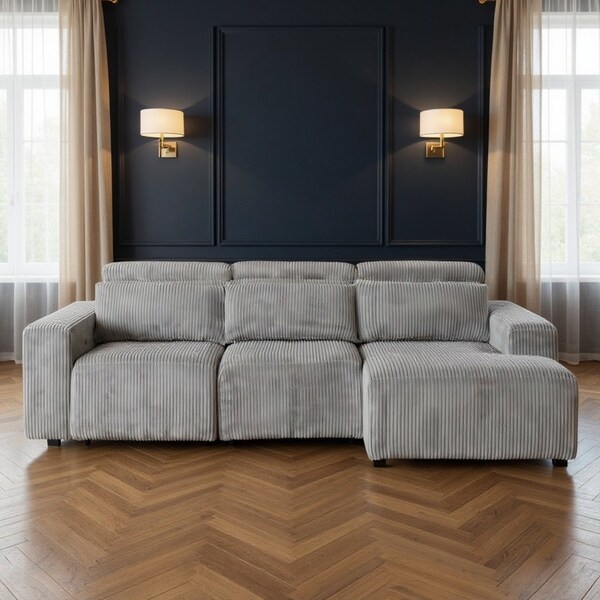 Add an air of fashion to your space with this fabulous light gray corduroy sleeper l shaped sofa and chaise sectional. This solid color sofa and chaise sectional is made from corduroy that is unique and gives this piece some special flair. Solid colors give you lots of decorative options and are easy to work into your decor scheme. Square arms offer a comfy place to rest. For the ultimate in relaxation, this sectional includes power - push button recline that turns it into a comfy lounge for sleeping or resting. Black metal legs effortlessly elevate the room and add a touch of contemporary design. A great showpiece for your room, this sectional is a must have. 36-inch h x 114-inch w x 71-inch d.