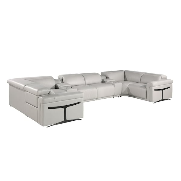 Superior construction from fabulously soft and high-grade leather gives this light gray Italian leather power reclining u shaped eight piece corner sectional with console a leg up on the competition. The premium leather used makes your lounging luxuriously comfortable and adds an elegant appeal to your space. This sectional includes two power recliners and lots convenient amenities. Square arms offer a comfy place to rest. For the ultimate in relaxation, this sectional includes power - push button recline that turns it into a comfy lounge for sleeping or resting. Black metal legs effortlessly elevate the room and add a touch of contemporary design. Great for everyday lounging and for entertaining, sectionals are an ideal way to seat multiple people. 39.00-inch h x 172.00-inch w x 82.50-inch d.