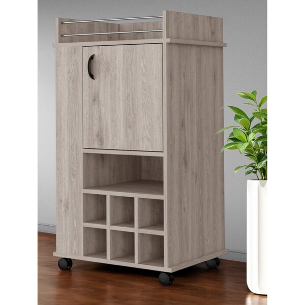 Add a touch of modern elegance to your home with this light gray rolling bar cart with wine storage. Crafted from manufactured wood, both the frame and top of the bar cart boast durability and style. With its rectangular shape, this bar cart offers ample space for serving drinks and snacks. The convenient cabinets allow for easy storage of glassware and other bar essentials. Equipped with wheels, this cart can be effortlessly moved around your space. The light gray color adds a subtle sophistication to any room decor. Not only does this bar cart offer functionality, but it also features wine storage, holding up to 6 bottles. Elevate your hosting game with this versatile and sleek bar cart. 38.77-inch H x 21.65-inch W x 16.33-inch D