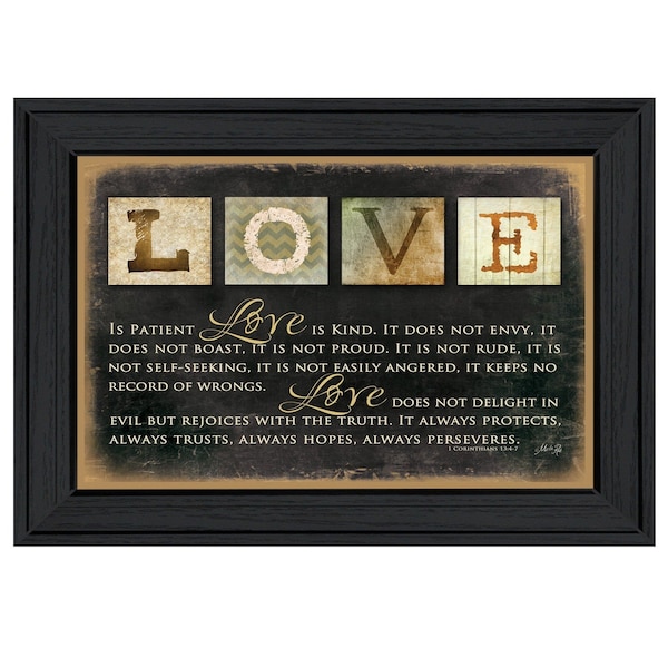 This love 1 black framed print wall art will add a beautiful decorative accent to your decor. This print is a visual artistic expression that allows you to decorate your space in style. Reproduced for you on paper, this hanging decorative accent will be a trendy and fashionable way to dress your walls. Hang on your wall to add some up to date fashion and decoration. Instantly liven up your space with this art that brings color and dimension to your walls. 11-inch H x 15-inch W x 1-inch D