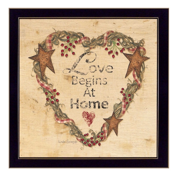 Bring some sizzle to your space with this eye-catching love begins at home 1 black framed print wall art. This print is a visual artistic expression that allows you to decorate your space in style. Reproduced for you on paper, this hanging decorative accent will be a trendy and fashionable way to dress your walls. Adding this hanging wall art to your space to make your room feel more finished and attractive. Utilize this opportunity to create a focal point in the room with this fabulous wall decor option. 14-inch H x 14-inch W x 1-inch D