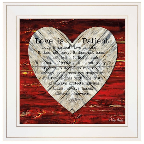 The love is patient 1 white framed print wall art is the perfect decorative accessory for your home. This print is a visual artistic expression that allows you to decorate your space in style. Reproduced for you on paper, this hanging decorative accent will be a trendy and fashionable way to dress your walls. Hang on your wall to add some up to date fashion and decoration. Instantly liven up your space with this art that brings color and dimension to your walls. 15-inch H x 15-inch W x 1-inch D
