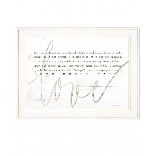 Bring some sizzle to your space with this eye-catching love never fails 2 white framed print wall art. This print is a visual artistic expression that allows you to decorate your space in style. Reproduced for you on wood, this hanging decorative accent will be a trendy and fashionable way to dress your walls in a rustic and modern farmhouse vibe. Hang on your wall to add some up to date fashion and decoration. Utilize this opportunity to create a focal point in the room with this fabulous wall decor option. 15-inch H x 19-inch W x 1-inch D