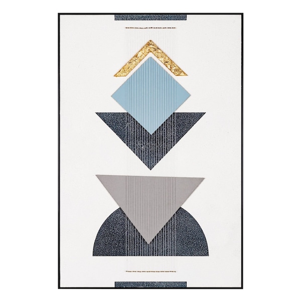 This mod geo black shadowbox frame textual art wall art will add a beautiful decorative accent to your decor. This modern and contemporary mixed media art is a way to express your artistic style and add some fashion to your walls. Reproduced for you on metal, this unique hanging decorative accent features geometric shapes, shades of blue and pops of gold to create a trendy and fashionable way to dress your walls. Utilize this opportunity to create a focal point in the room with this fabulous wall decor option. 41-inch h x 29-inch w x 4-inch d.
