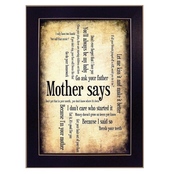 This mother says 1 black framed print wall art will add a beautiful decorative accent to your decor. This print is a visual artistic expression that allows you to decorate your space in style. Reproduced for you on paper, this hanging decorative accent will be a trendy and fashionable way to dress your walls. Adding this hanging wall art to your space to make your room feel more finished and attractive. Instantly liven up your space with this art that brings color and dimension to your walls. 10-inch H x 14-inch W x 1-inch D