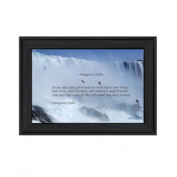 This niagara falls black framed print wall art will add a beautiful decorative accent to your decor. This print is a visual artistic expression that allows you to decorate your space in style. Reproduced for you on wood, this hanging decorative accent will be a trendy and fashionable way to dress your walls in a rustic and modern farmhouse vibe. Hang on your wall to add some up to date fashion and decoration. Utilize this opportunity to create a focal point in the room with this fabulous wall decor option. 11-inch H x 13-inch W x 1-inch D