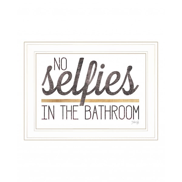Bring some sizzle to your space with this eye-catching no selfies in the bathroom 5 white framed print bathroom wall art. This print is a visual artistic expression that allows you to decorate your space in style. Reproduced for you on wood, this hanging decorative accent will be a trendy and fashionable way to dress your walls in a rustic and modern farmhouse vibe. Hang on your wall to add some up to date fashion and decoration. Instantly liven up your space with this art that brings color and dimension to your walls. 15-inch H x 21-inch W x 1-inch D