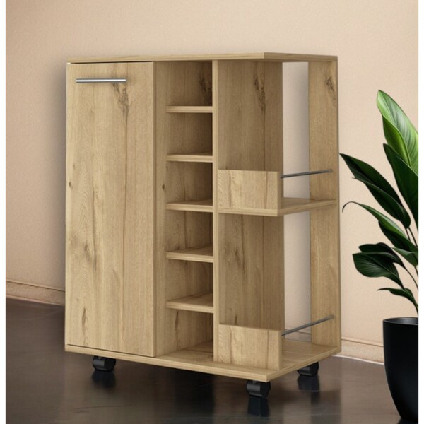 The oak rolling bar cart with wine storage is the perfect addition to your modern home decor. Crafted from manufactured wood, this bar cart features a rectangular shape and a beautiful oak color. It comes with cabinets, providing ample storage space for your favorite spirits and glassware. The bar cart also includes wheels, allowing for easy mobility and convenience during your gatherings. With its wine storage feature, you can showcase up to six bottles of wine, making it a stylish and functional piece for entertaining guests. Elevate your hosting experience with the oak rolling bar cart with wine storage, a must-have for any modern home. 32.32-inch H x 23.62-inch W x 14.76-inch D