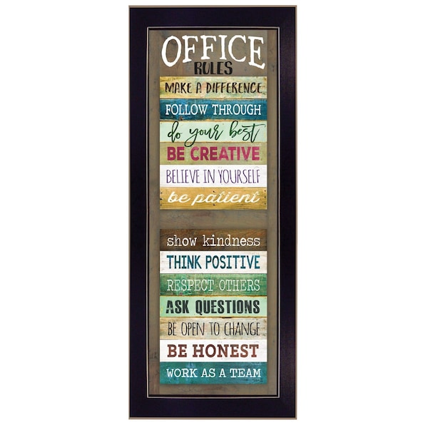 The office rules 6 black framed print wall art is the perfect decorative accessory for your home. This print is a visual artistic expression that allows you to decorate your space in style. Reproduced for you on paper, this hanging decorative accent will be a trendy and fashionable way to dress your walls. Hang on your wall to add some up to date fashion and decoration. Utilize this opportunity to create a focal point in the room with this fabulous wall decor option. 26-inch H x 10-inch W x 1-inch D