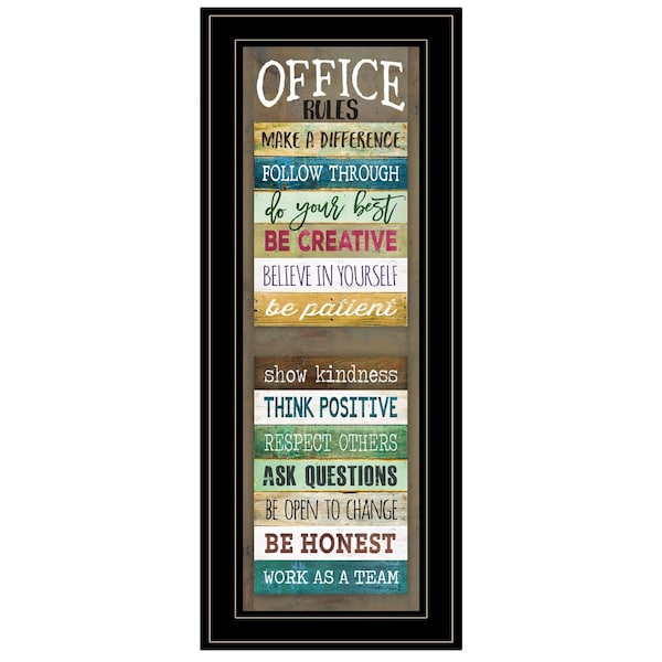 This office rules 8 black framed print wall art will add a beautiful decorative accent to your decor. This print is a visual artistic expression that allows you to decorate your space in style. Reproduced for you on paper, this hanging decorative accent will be a trendy and fashionable way to dress your walls. Hang on your wall to add some up to date fashion and decoration. Utilize this opportunity to create a focal point in the room with this fabulous wall decor option. 27-inch H x 11-inch W x 1-inch D