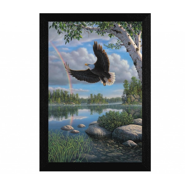 Unique and decorative, this on eagles wings 1 black framed print wall art will leave a lasting impression. This print is a visual artistic expression that allows you to decorate your space in style. Reproduced for you on paper, this hanging decorative accent will be a trendy and fashionable way to dress your walls. Hang on your wall to add some up to date fashion and decoration. Utilize this opportunity to create a focal point in the room with this fabulous wall decor option. 18-inch H x 14-inch W x 1-inch D