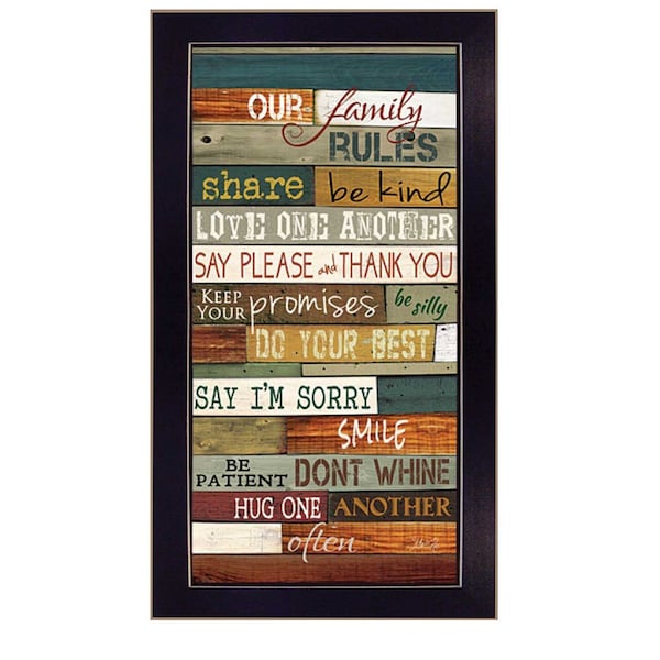 Add an air of fashion to your room and rejuvenate the space with this our family rules black framed print wall art. This print is a visual artistic expression with a wood plank look that allows you to decorate your space in style. Reproduced for you on paper, this hanging decorative accent will be a trendy and fashionable way to dress your walls. Instantly liven up your space with this family art that brings color, dimension, and warm loving family advice to your walls. 20-inch H x 11-inch W x 1-inch D