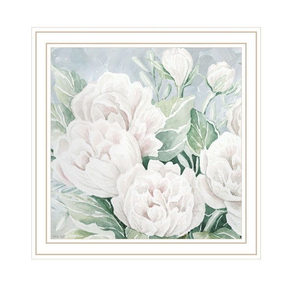 This peaceful peonies in full bloom white framed print wall art will add a beautiful decorative accent to your decor. This print is a visual artistic expression that allows you to decorate your space in style. Reproduced for you on wood, this hanging decorative accent will be a trendy and fashionable way to dress your walls in a rustic and modern farmhouse vibe. Hang on your wall to add some up to date fashion and decoration. Utilize this opportunity to create a focal point in the room with this fabulous wall decor option. 14-inch H x 14-inch W x 1-inch D