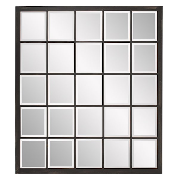 A rectangular metal frame that houses mirrored tiles that create a windowpane effect. It is then finished in an oil rubbed bronze. This perfect accent piece for an entryway, bathroom, bedroom or any room in your home. D-rings are attached to the back of the mirror so it is ready to hang right out of the box in a horizontal or vertical orientation! Each mirrored glass tile on this piece is beveled adding to its beauty and style.