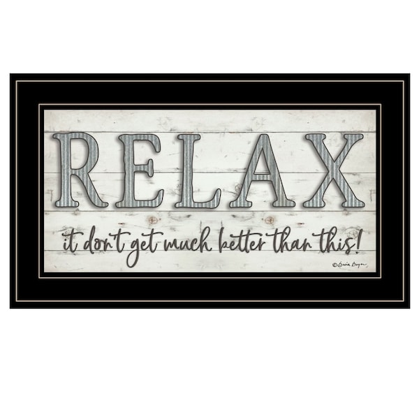 This relax 4 black framed print bathroom wall art will add a beautiful decorative accent to your decor. This print is a visual artistic expression that allows you to decorate your space in style. Reproduced for you on paper, this hanging decorative accent will be a trendy and fashionable way to dress your walls. Hang on your wall to add some up to date fashion and decoration. Utilize this opportunity to create a focal point in the room with this fabulous wall decor option. 12-inch H x 21-inch W x 1-inch D