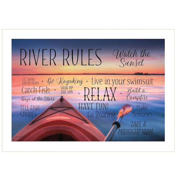 This river rules 2 white framed print wall art will add a beautiful decorative accent to your decor. This print is a visual artistic expression that allows you to decorate your space in style. Reproduced for you on paper, this hanging decorative accent will be a trendy and fashionable way to dress your walls. Hang on your wall to add some up to date fashion and decoration. Instantly liven up your space with this art that brings color and dimension to your walls. 14-inch H x 20-inch W x 1-inch D