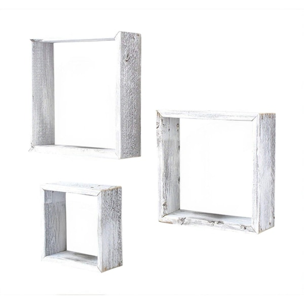 Set Of 3 Square Rustic White Wash Wood Open Box Shelve, 3PK