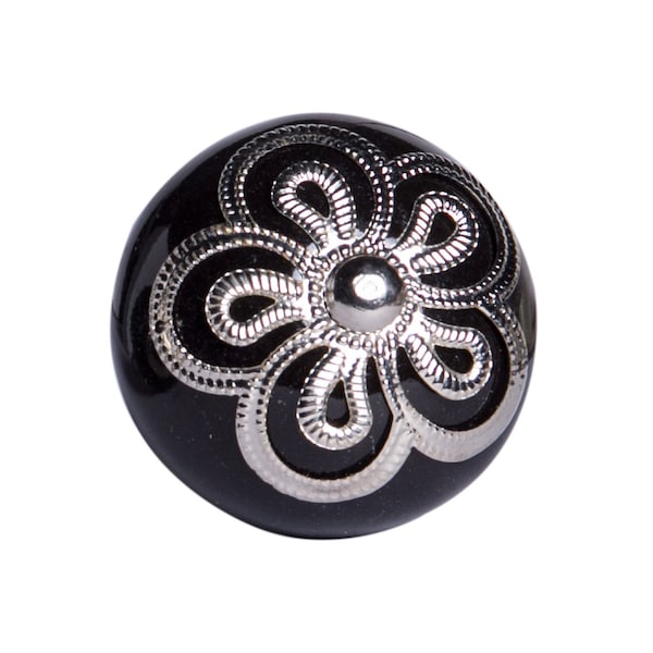Give your drawers or cabinets a facelift with this set of eight black and silver ceramic and metal drawer pull knobs. Improve the look of your old boring or builder grade furniture and cabinetry with these high quality round knob traditional style knobs. Hand-painted by talented artisans, these knobs will add a touch of artisanal design. 1.5-inch h x 1.5-inch w x 1.5-inch d.