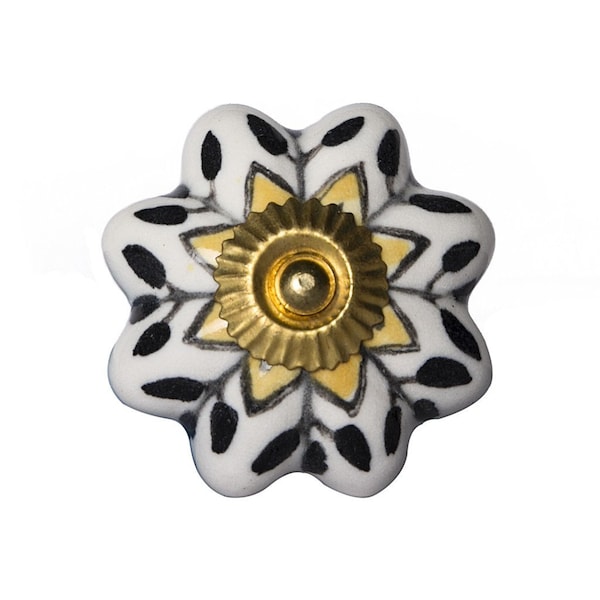Give your drawers or cabinets a facelift with this set of eight black and yellow ceramic and metal drawer pull knobs. A favorite of designers and diyer's alike, these high quality round knob traditional style knobs are versatile in use and will change up the look of your existing furniture and cabinetry in a snap. Hand-painted by talented artisans, these knobs will add a touch of artisanal design. 1.5-inch h x 1.5-inch w x 1.5-inch d.