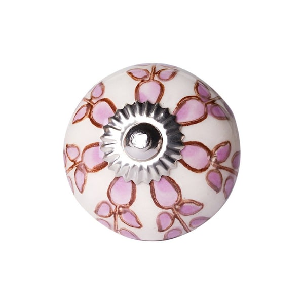 Upgrade the appearance of your furniture and cabinets effortlessly with this collection of eight exquisite ceramic drawer pull knobs in pink and white hues. Each knob boasts a hand painted design and a classic round shape that adds a touch of elegance to your living space. Crafted from high-quality ceramic, these knobs are both durable and stylish. Complete with backplates and screws included, these knobs are the perfect solution to enhance the charm of your home decor with a floral botanical theme. 1.5-inch h x 1.5-inch w x 1.5-inch d.