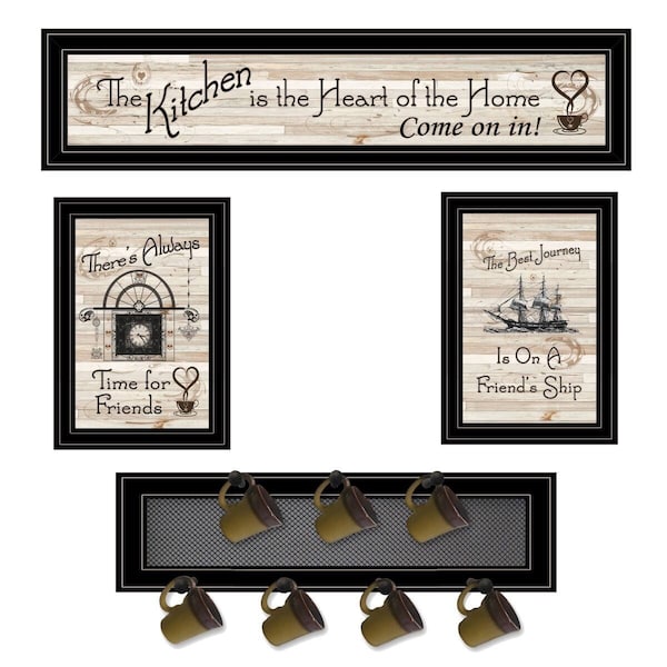 The set of four kitchen prints and mug rack is the perfect decorative accessory for your home. This set includes three framed prints and a pegged rack for mugs, keys, towels, or anything else you might want to hang from it. This hanging decorative set accent will be a trendy and fashionable way to dress your walls. Utilize this opportunity to create a focal point in the room with these fabulous wall decor options.