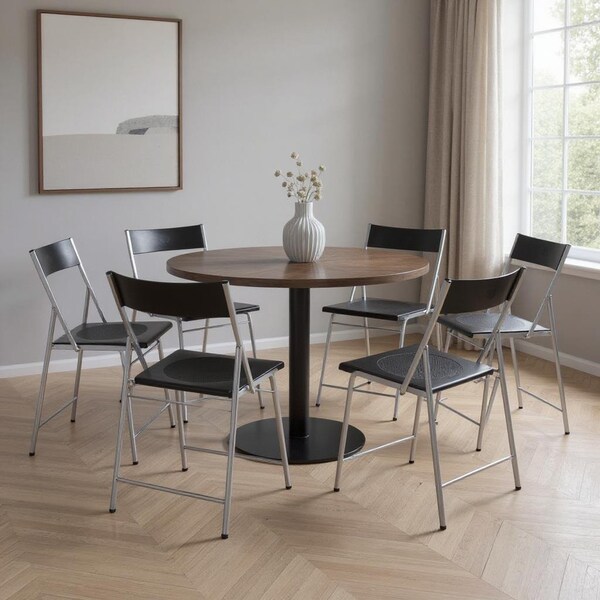 Add extra seating to most any space with this versatile set of six black and silver aluminum folding side chairs. With no arms, these open back folding chairs easily fit around the table or anywhere you need to add extra seating. Sturdy enough for everyday use, these chairs are a perfect solution for your next party, event, or gathering as they can be moved and used in most any space indoors or out. These lightweight yet durable chairs are convenient and practical as they fold to be portable or put away for when not needed. Multiple units can be stacked on top of one another for storing when not in use. A great way to compliment your kitchen room but can also be used on the patio, lawn, conference room, hallway, or any room you might need extra seating. 34.60-inch h x 16.90-inch w x 15.40-inch d.