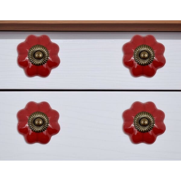 Give your drawers or cabinets a facelift with this set of six red floral knob ceramic drawer pull knobs. Hand-painted by talented artisans, these knobs will add a touch of artisanal design. Each floral knob is crafted from durable ceramic, ensuring a long-lasting and vibrant finish. Designed to be both functional and decorative, they can effortlessly enhance the aesthetic of any furniture. With screws included, installation is simple and hassle-free. Elevate your home decor with these unique and charming knobs that bring a pop of color and character to your space. 1.75-inch h x 1.75-inch w x 3.50-inch d.