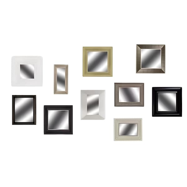 Enrich your living space with this unique set of ten brown and white square, rectangle framed mirror set. The frames of these mirrors are made from sturdy polystyrene and creates a unique multi-color, multi design look that includes natural wood, black, brown, gold, beige, walnut, and champagne colorations. Make any space glow with this fun assortment of fantastic handcrafted frames. This set of mirrors will not only be a great practical addition to any location of your home but will also help elevate the space in the room. 9-inch H x 8-inch W x 1-inch D