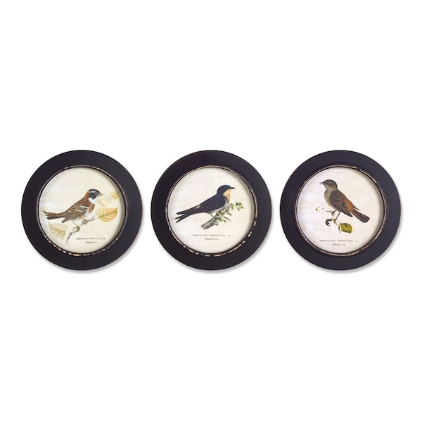 Bring some sizzle to your space with this eye-catching set of three black bird circle framed art. Instantly liven up your space with this art that brings color and dimension to your walls. This bird inspired art will be a great addition to your space. Hang on your wall to add some up to date fashion and decoration. Utilize this opportunity to create a focal point in the room with this fabulous wall decor option. 9.5-inch h x 0.5-inch w x 9.5-inch d.