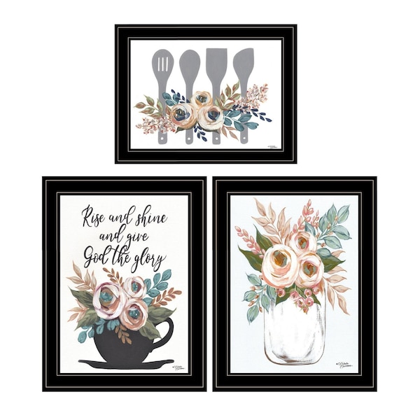 The set of three rise and shine kitchen black framed print kitchen wall art is the perfect decorative accessory for your home. This print is a visual artistic expression that allows you to decorate your space in style. Reproduced for you on wood, this hanging decorative accent will be a trendy and fashionable way to dress your walls in a rustic and modern farmhouse vibe. Hang on your wall to add some up to date fashion and decoration. Instantly liven up your space with this art that brings color and dimension to your walls. 35-inch H x 31-inch W x 1-inch D