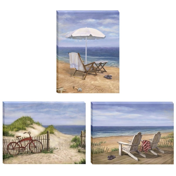 Unique and decorative, this set of three sand beach designs wrapped canvas print wall art will leave a lasting impression. This print is a visual artistic expression that allows you to decorate your space in style. Reproduced for you on canvas, this hanging decorative accent will be a trendy and fashionable way to dress your walls. Hang on your wall to add some up to date fashion and decoration. Utilize this opportunity to create a focal point in the room with this fabulous wall decor option. 12-inch H x 16-inch W x 1-inch D