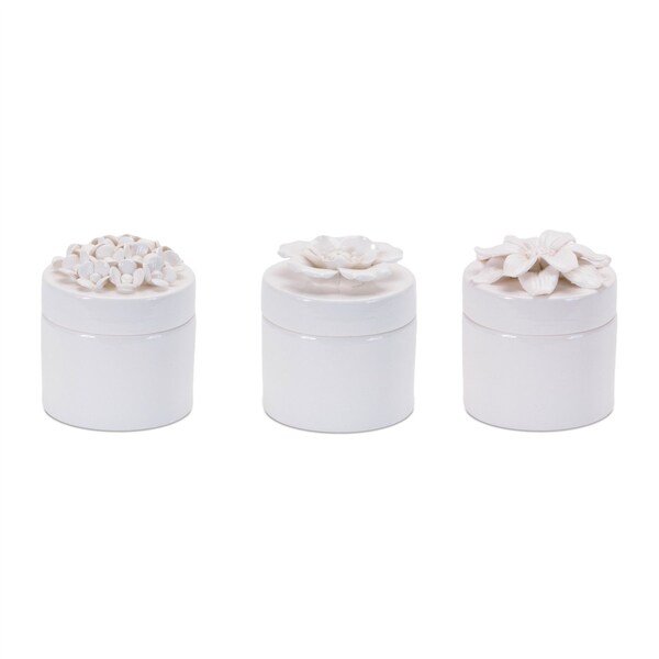 Bring some sizzle to your space with this eye-catching set of three white ceramic flowers decorative keepsake box. Crafted from stoneware with a creamy glazed finished, these boxes feature three different sculptural flowers on their lids. Perfect for hiding small trinkets or treats, these boxes are both functional and decorative. 4.5-inch h x 4-inch w x 4-inch d.