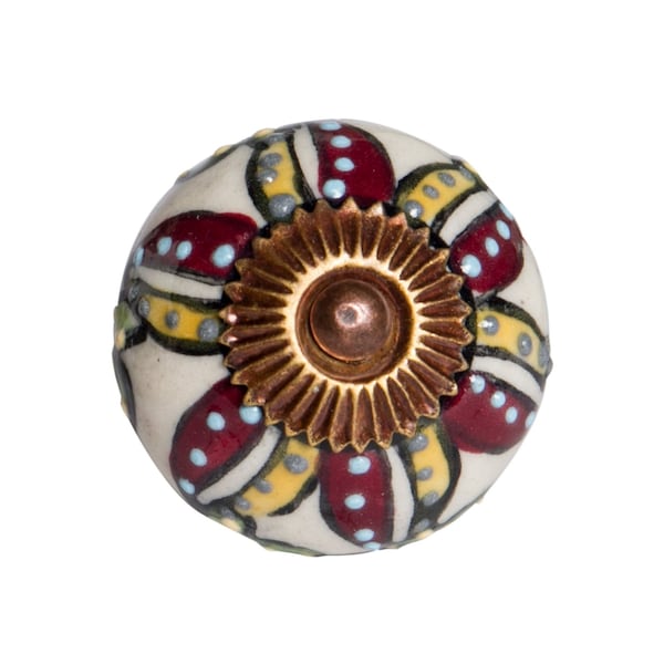 Transform your space quickly and easily with this set of twelve red and yellow botanical ceramic drawer pull knobs. A favorite of designers and diyer's alike, these high quality round knob traditional style knobs are versatile in use and will change up the look of your existing furniture and cabinetry in a snap. Hand-painted by talented artisans, these knobs will add a touch of artisanal design. 1.5-inch h x 1.5-inch w x 1.5-inch d.