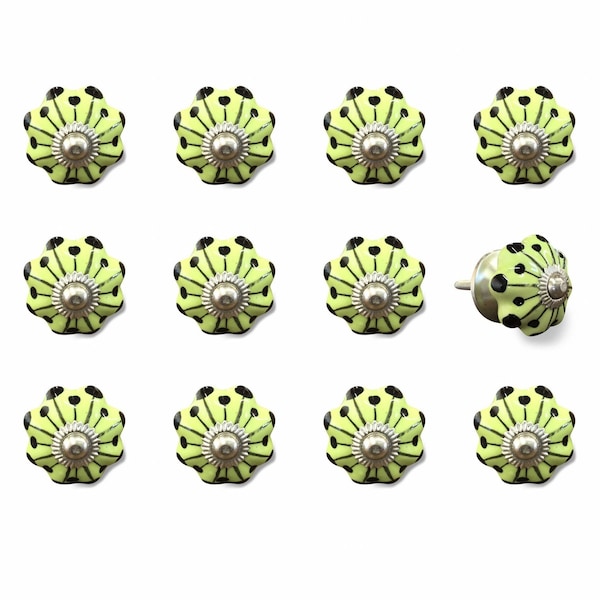 Give your drawers or cabinets a facelift with this set of twelve yellow green and silver floral ceramic drawer pull knobs. Improve the look of your old boring or builder grade furniture and cabinetry with these high quality novelty knob contemporary style knobs. Hand-painted by talented artisans, these knobs will add a touch of artisanal design. 1.5-inch h x 1.5-inch w x 1.5-inch d.