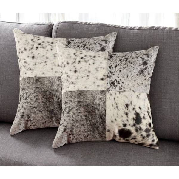 The set of two 18-inch black and white cowhide throw pillows is the perfect decorative accessory for your home. Indulge in a bit of luxury with these salt and pepper colored decorative pillows covered with high grade, genuine cowhide. Elegantly chic, these pillows are the epitome of luxury. This soft polyfill filled pillow not only is decorative but made to be comfy and cozy all day long. Great to use on its own or mix with other decorations for the perfect look. A great decorative accessory to add color and dimension to your favorite chair, accent your sofa, or to use as part of your bed ensemble. 18-inch h x 18-inch w x 5-inch d.