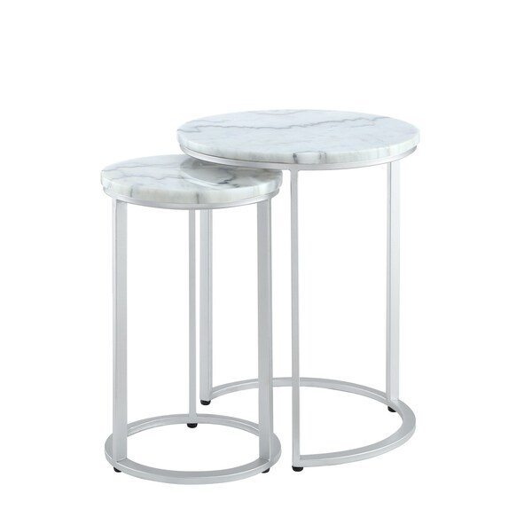 Show off your exquisite taste with this set of two 22-inch silver and white marble round nested tables. The nesting feature is a great space saver for when not in use. The base of this table is made from iron in a silver color that is a nice contrast to the white marble tabletop. Side tables are a great way to flank your sofa, use as an accent next to your favorite chair, or can even be used bedside. This versatile table is a great accent for most any room. 22-inch H x 17.5-inch W x 17.5-inch D