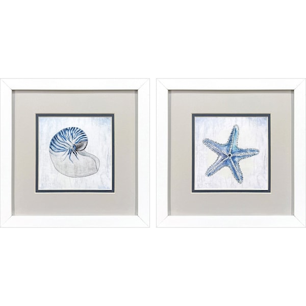 Bring some sizzle to your space with this eye-catching set of two azure shell white framed wall art. This block print is a way to express your artistic style and add some fashion to your walls. Reproduced for you on paper, this hanging decorative accent will be a trendy and fashionable way to dress your walls. Adding this hanging wall art to your space to make your room feel more finished and attractive. Utilize this opportunity to create a focal point in the room with this fabulous wall decor option. 11.00-inch h x 11.00-inch w x 2.00-inch d.