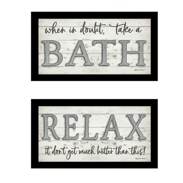Bring some sizzle to your space with this eye-catching set of two bath relax 3 black framed print bathroom wall art. This print is a visual artistic expression that allows you to decorate your space in style. Reproduced for you on paper, this hanging decorative accent will be a trendy and fashionable way to dress your walls. Hang on your wall to add some up to date fashion and decoration. Utilize this opportunity to create a focal point in the room with this fabulous wall decor option. 11-inch H x 20-inch W x 1-inch D