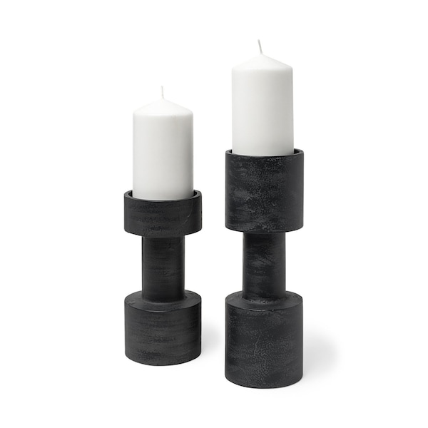 This set of two black distressed metal tabletop pillar candle holders is a great addition to your home decor and sure to complement your existing furniture. Handmade by skilled craftsmen and designed to add a glamorous glow to any event or table setting. This candleholder is the perfect illuminating design to accent your space in style. Candleholders are an attractive way to turn a simple candle into a piece of decor. 10.63-inch h x 3.94-inch w x 3.94-inch d.