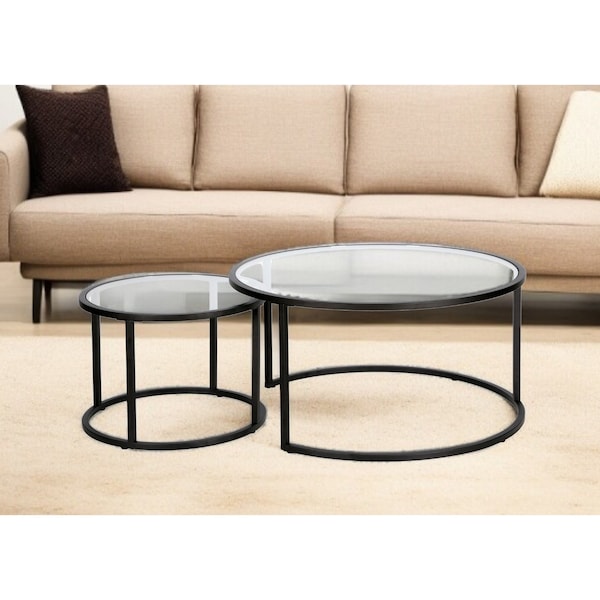 Show off your exquisite taste with this set of two black glass and steel round frame nested coffee tables. The nesting feature is a great space saver for when not in use. This table features an updated monotone color scheme with black as the main color on both the glass top and the steel base. This round table utilizes its unique shape to give your room a modern geometric accent. If you're looking for something that can fit into a living area, bedroom, or office, this coffee table is for you. 18-inch h x 35-inch w x 35-inch d.