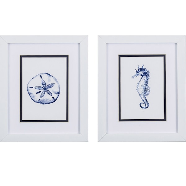 Blue and White Beach Icons Wall Art is a great way to bring that coastal, tropical, and beach feel into your space. Double matted and framed under glass in crisp white molding, this adorable sand dollar and seahorse will be a great addition to almost any room. The coordinating set can be hung together or used separately as you choose. 11-inch H x 9-inch W x 1-inch D