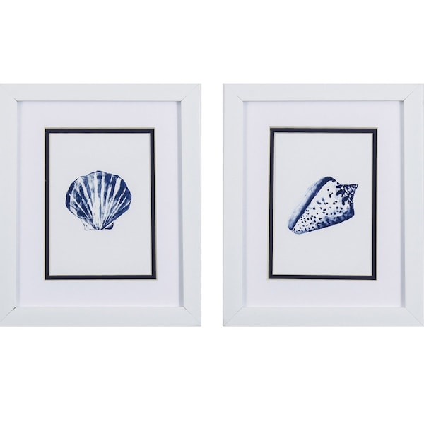 Blue and White Seashell Wall Art is a great way to bring that coastal, tropical, and beach feel into your space. Double matted and framed under glass in crisp white molding, this adorable set of two different seashells will be a great addition to almost any room. The coordinating set can be hung together or used separately as you choose. 11" x 9" x 1" each. Set of 2.