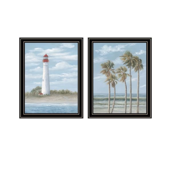 Add an air of fashion to your room and rejuvenate the space with this set of two cape may lighthouse and palm trees black framed wall art. This acrylic painting set is a way to express your artistic style and add some fashion to your walls. Reproduced for you on paper, these hanging decorative accents can be displayed together or separately as a fashionable way to dress your walls. Hang on your wall to add some up to date fashion and decoration. Instantly liven up your space with this coastal wall art that brings color and dimension to your walls. 18-inch h x 14-inch w x 1-inch d.