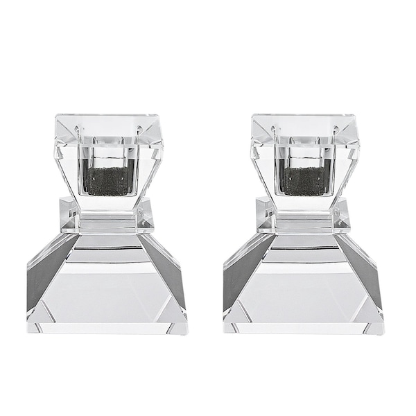 This set of two clear crystal tabletop taper candlesticks is a great addition to your home decor and sure to complement your existing furniture. Handmade by skilled craftsmen and designed to add a glamorous glow to any event or table setting. Dress up your home to impress every season with this fabulous candleholder. Candleholders are a decorative accent on their own, with or without candles. 3.25-inch h x 2.50-inch w x 2.50-inch d.
