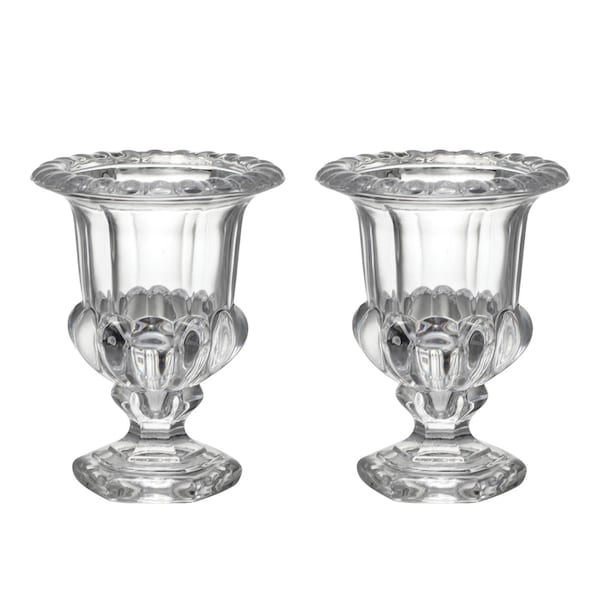 The set of two clear urn glass table vases brings elegance to any room. Crafted from high-quality glass, these vases feature a timeless urn shape that complements traditional decor beautifully. Perfect for displaying fresh flowers or as standalone decorative pieces, their clarity allows your floral arrangements to take center stage. The set includes two vases, making it easy to create a coordinated look in your space. Their classic design ensures versatility, seamlessly integrating into a variety of interior styles. Whether placed on a dining table or a mantel, these vases are sure to enhance the aesthetic of your home while providing a touch of sophistication to your decor. 5.9-inch h x 4.5-inch w x 4.5-inch d.