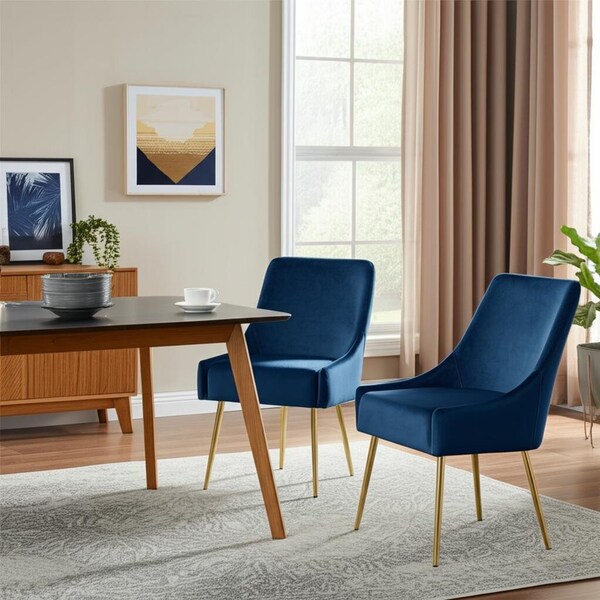 Bring this comfortable set of two navy blue and gold upholstered velvet dining side chairs to your table to enjoy long lasting quality time with your family and friends. This armless chair has a sleek silhouette making it ideal for seating around the table but can also double as an accent chair. The solid back gives this chair its unique style. Dining chairs are a great way to compliment your kitchen or dining room but can also be used in the foyer, hallway, or any room you might need extra seating. 33.5-inch h x 25-inch w x 22-inch d.